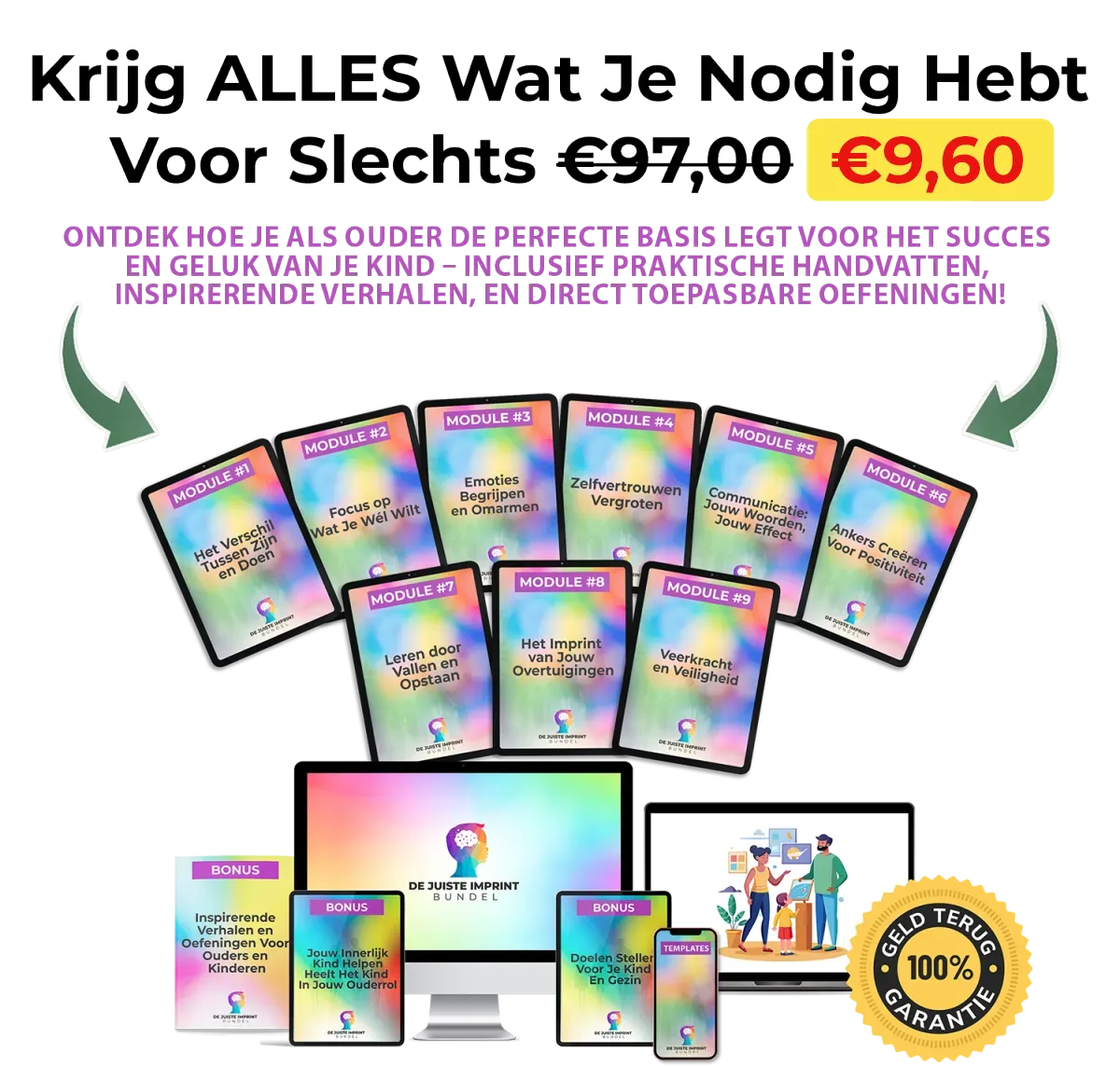 Met de “Juiste Imprint Bundel” heb je de ULTIEME OPLOSSING om met de juiste handvatten en praktische stappen voorgoed een positieve imprint bij je kind achter te laten.